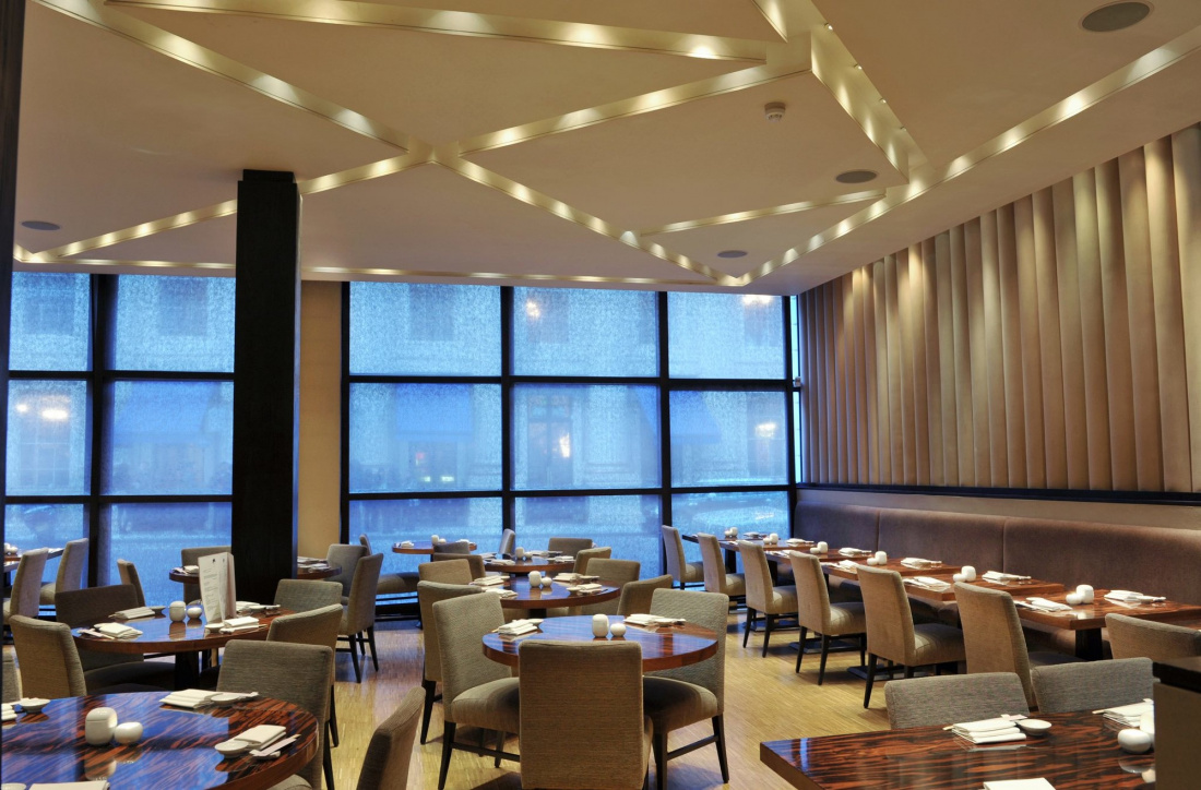 Тёмный интерьер обновлённого ресторана имеет минимум украшений. Многоуровневый потолок поддерживают прямоугольные колонны, на которых видна эмблема заведения. В середине основного зала устроен мини-пруд с рыбами.
