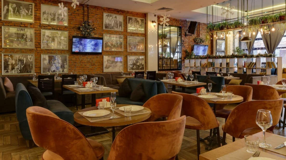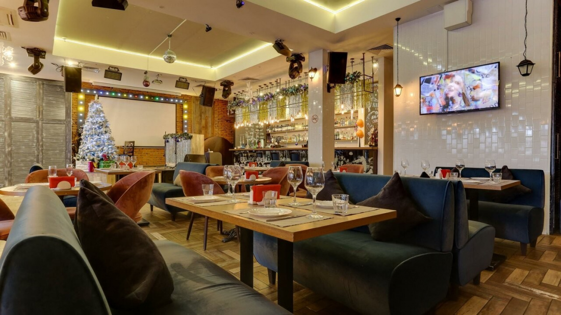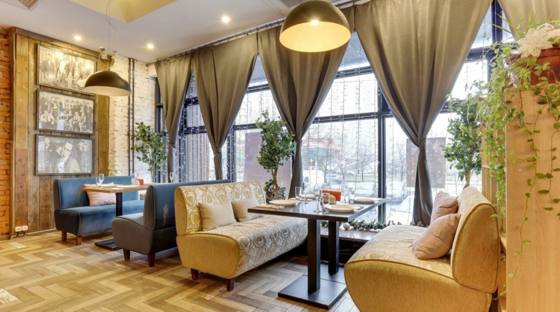 Интерьер оформлен в приятных светлых оттенках, здесь позаботились о комфорте гостей, вас ждет удобная мягкая мебель, интересное освещение, стильный бар, большие окна, множество декора.