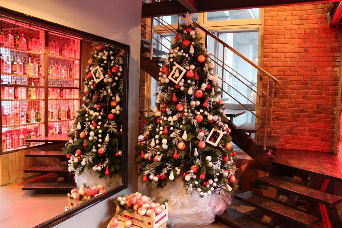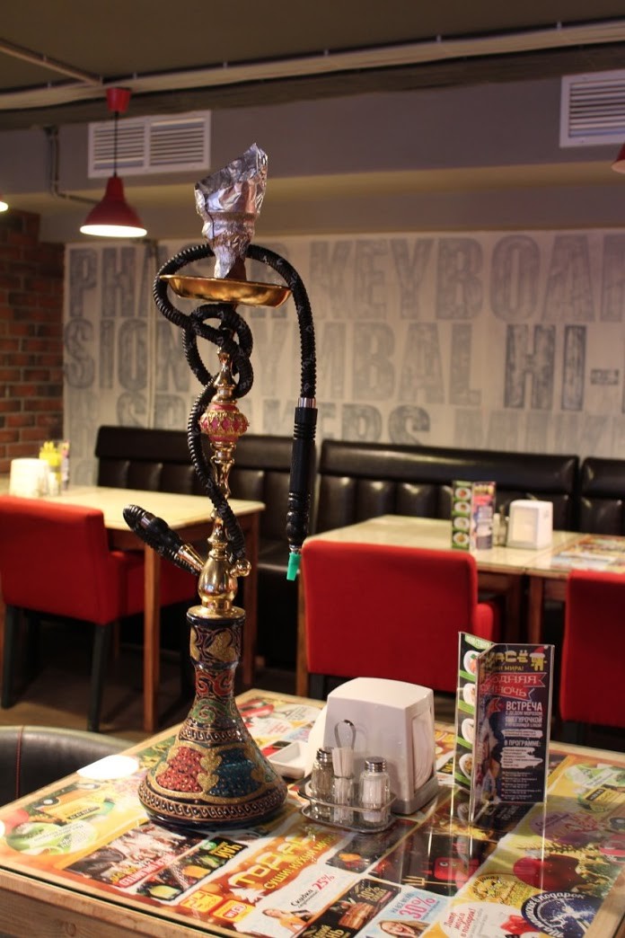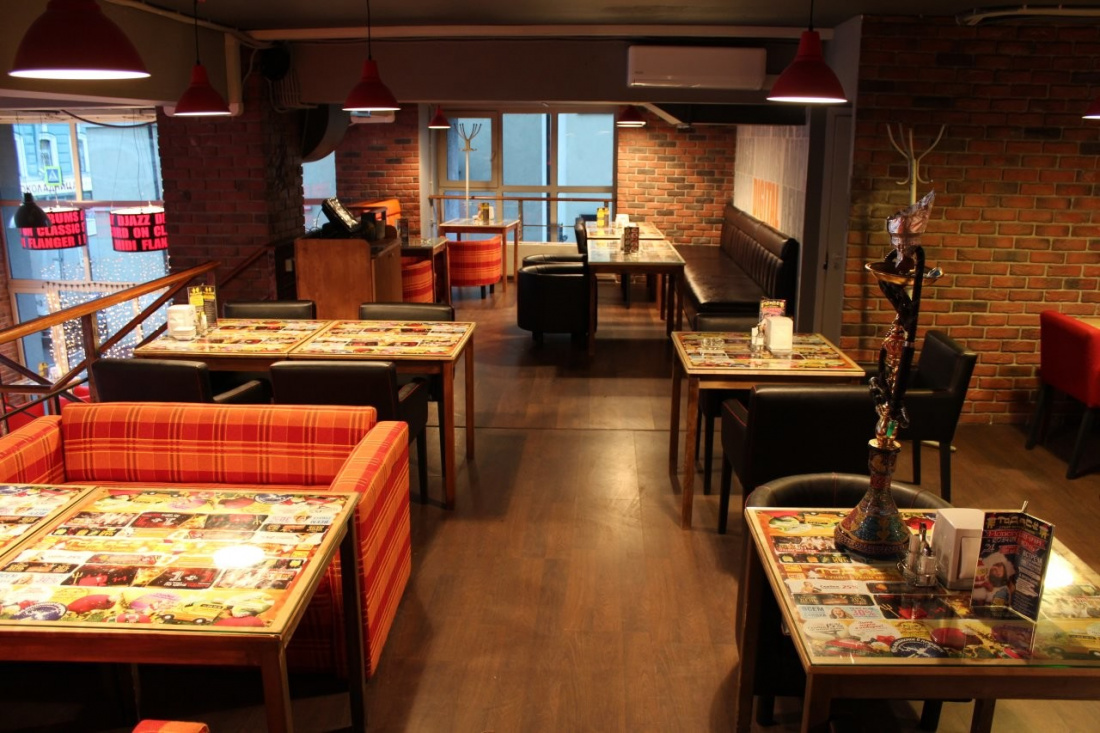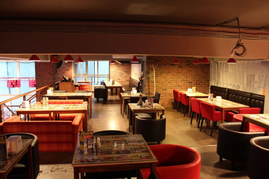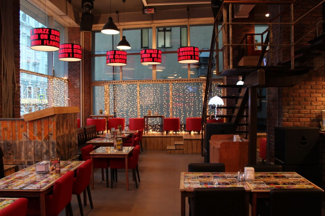 Помещение оформлено в современном стиле с красными диванами и большими окнами в пол. С понедельника по пятницу посетителям предлагают бизнес-ланч, а по выходным играет современная музыка и можно заказать поздний завтрак.