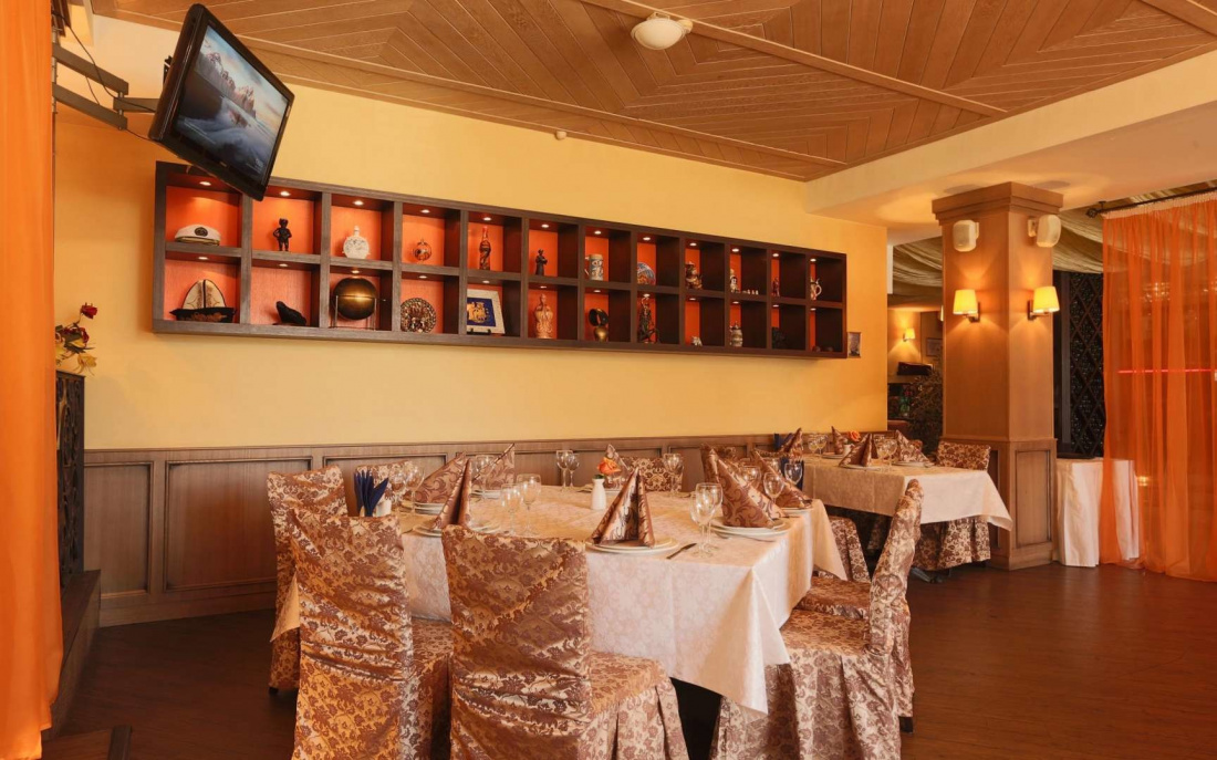 Ресторан Вояж оформлен в стиле кают-компании большого круизного лайнера. Здесь фьюжн-меню с блюдами из Японии, России, Европы, кавказских стран.