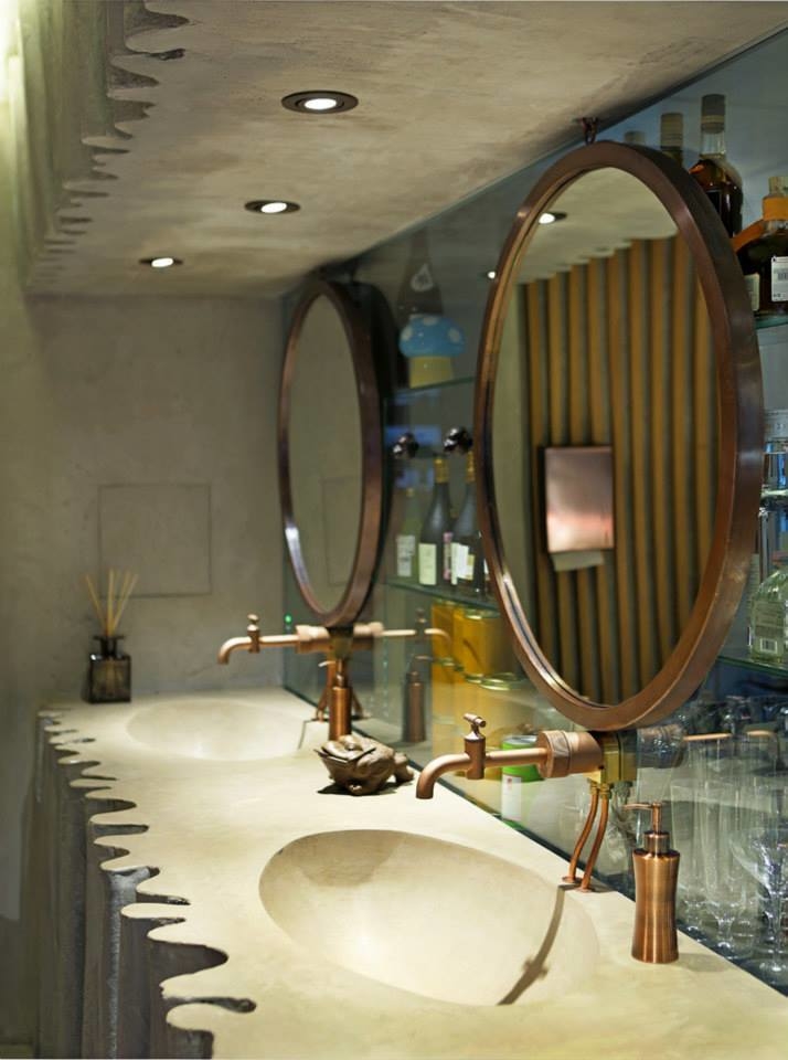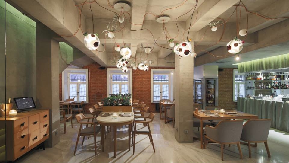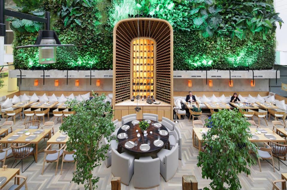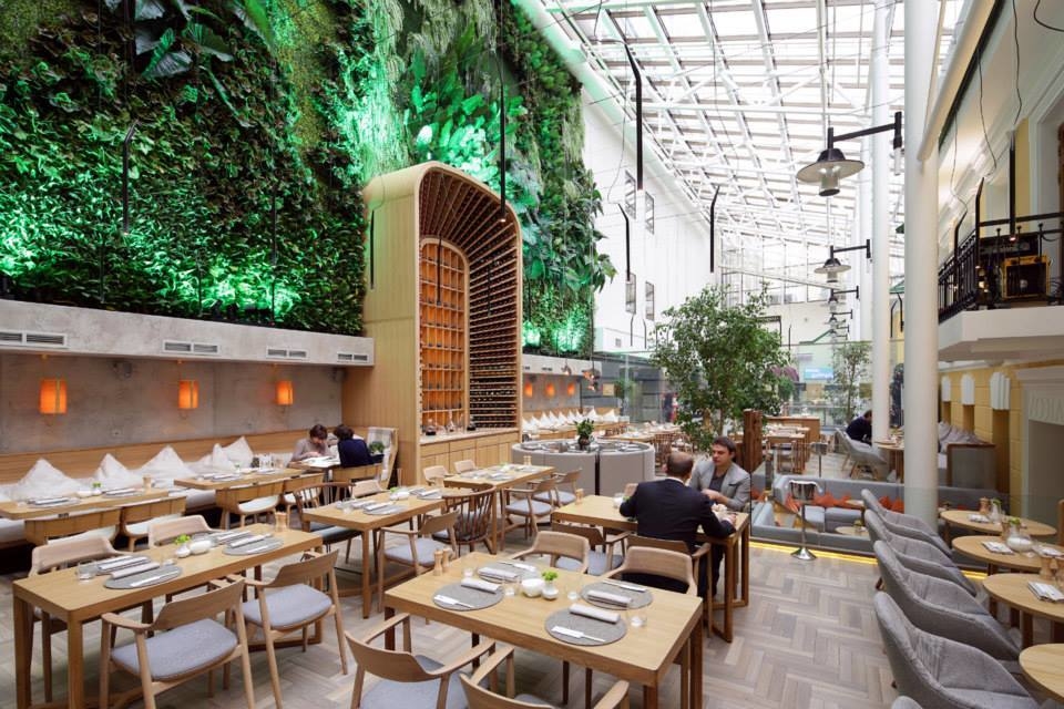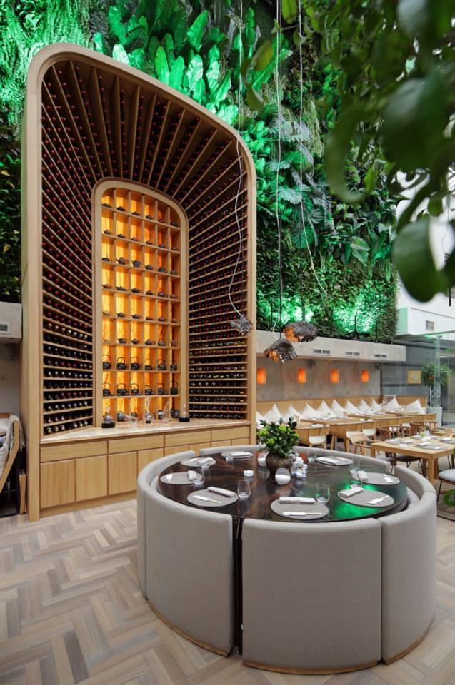 Огромный павильон с прозрачной крышей является верхним ярусом двухэтажного особняка 19 века, где находятся несколько внутренних залов ресторана. Одна из стен представляет собой сад экзотических растений, выполненный методом вертикального озеленения. Украшением зала является арочный стеллаж в восточном стиле, заполненный предметами для чайной церемонии.