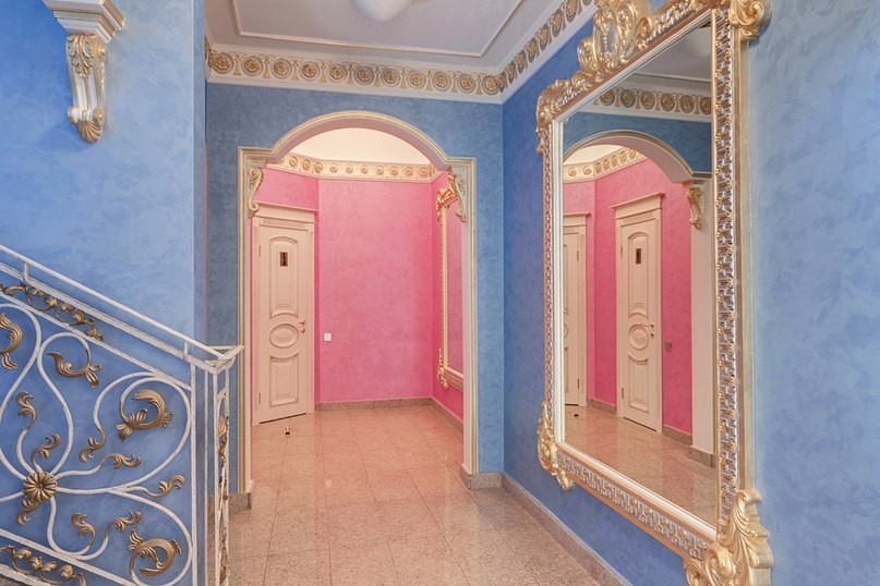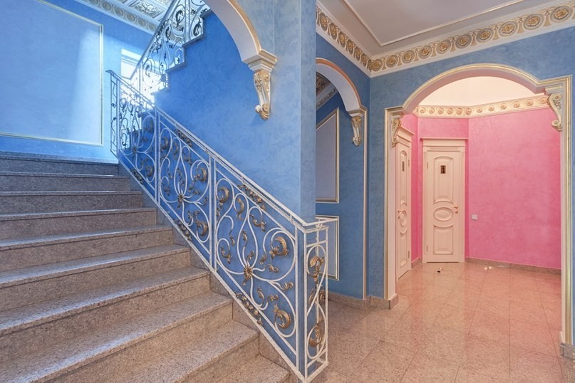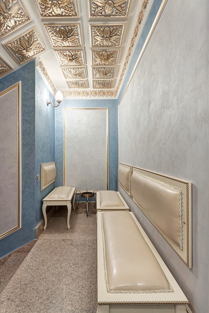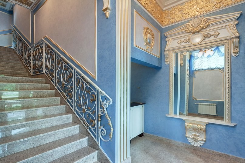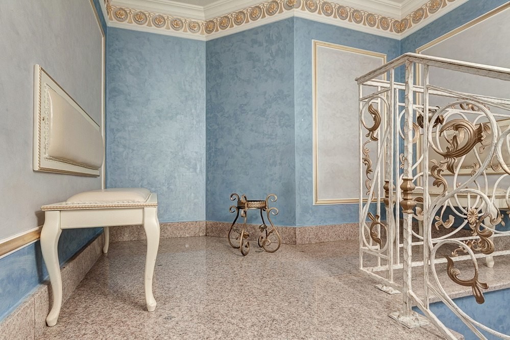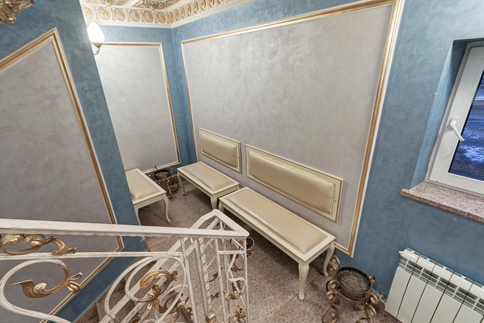 Позолота и резная лепнина украшают каждый элемент интерьера, а на 2 этаж ведёт кованая лестница с гранитными ступенями. Стены разрисованы реалистичными пейзажами, в каждом из залов одна из стен декорирована 3Д-панно. Потолок с лепниной поддерживают квадратные колонны с рустом и эффектной капителью.