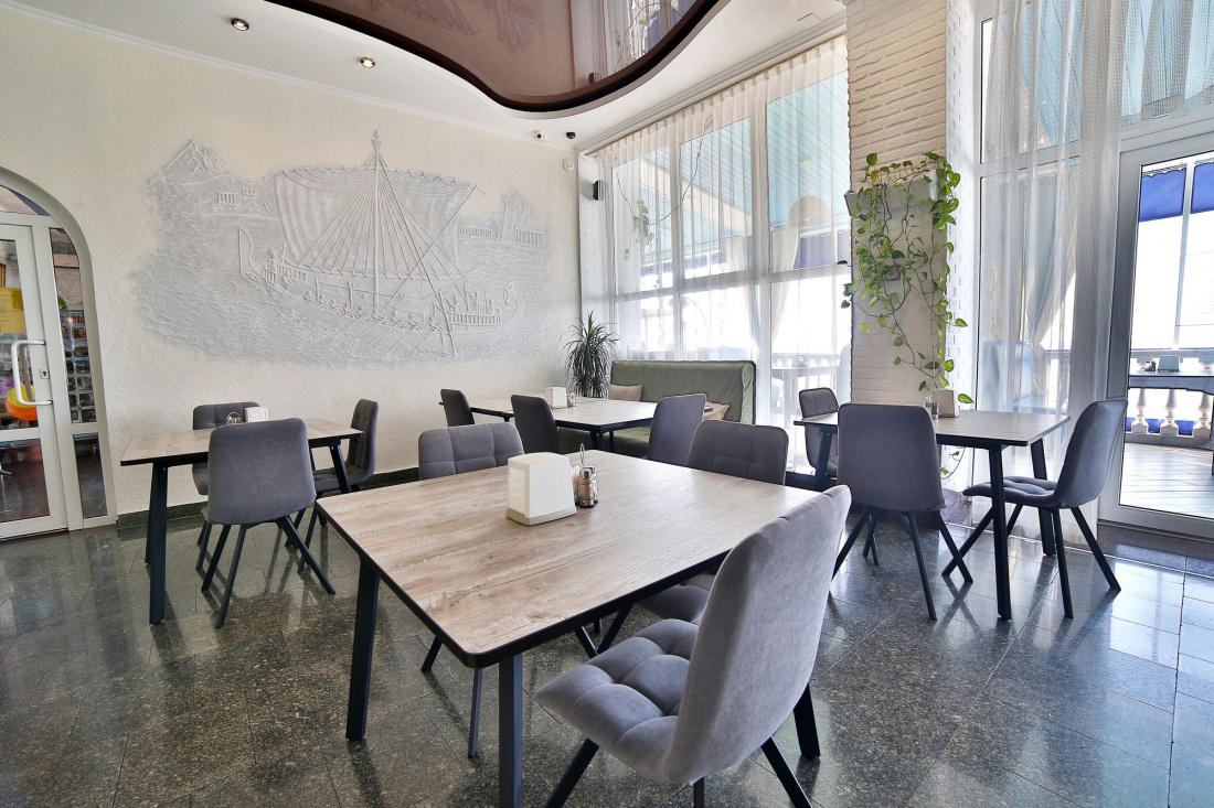 Светлый и просторный интерьер декорирован в греческом стиле. Здесь вы сможете не только утолить голод, но и отдохнуть на летней террасе с великолепным видом на море.