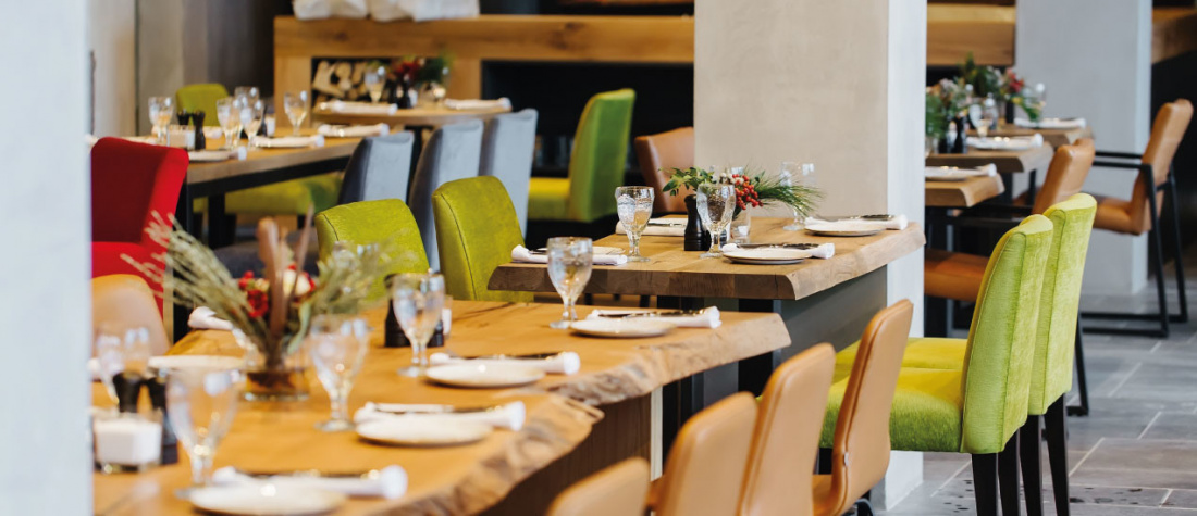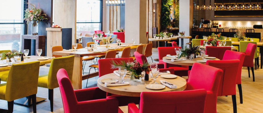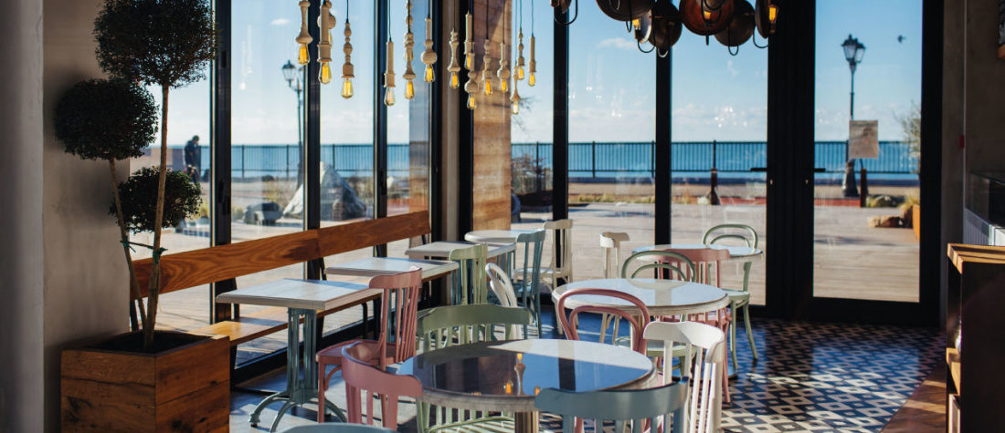 Интерьер ресторан в классическом стиле, а из панорамных окон открывается вид на Черное море. В ресторане собственная пекарня со свежей выпечкой и кофе.