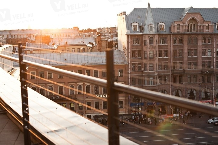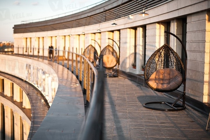 Ресторан располагается на крыше высокого здания и очень хорошо освещается. Небольшие столики соседствуют с удобными мягкими зонами, а текстиль и живые цветы в кадках придают интерьеру более уютный вид.