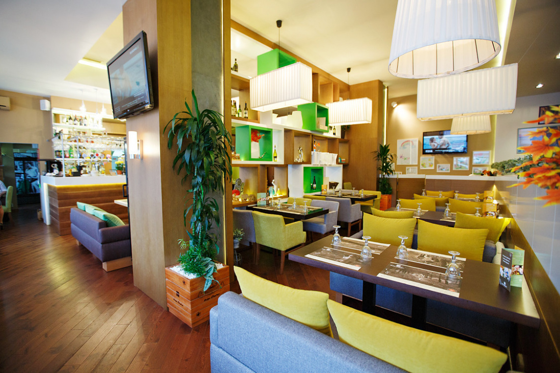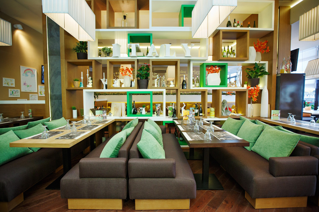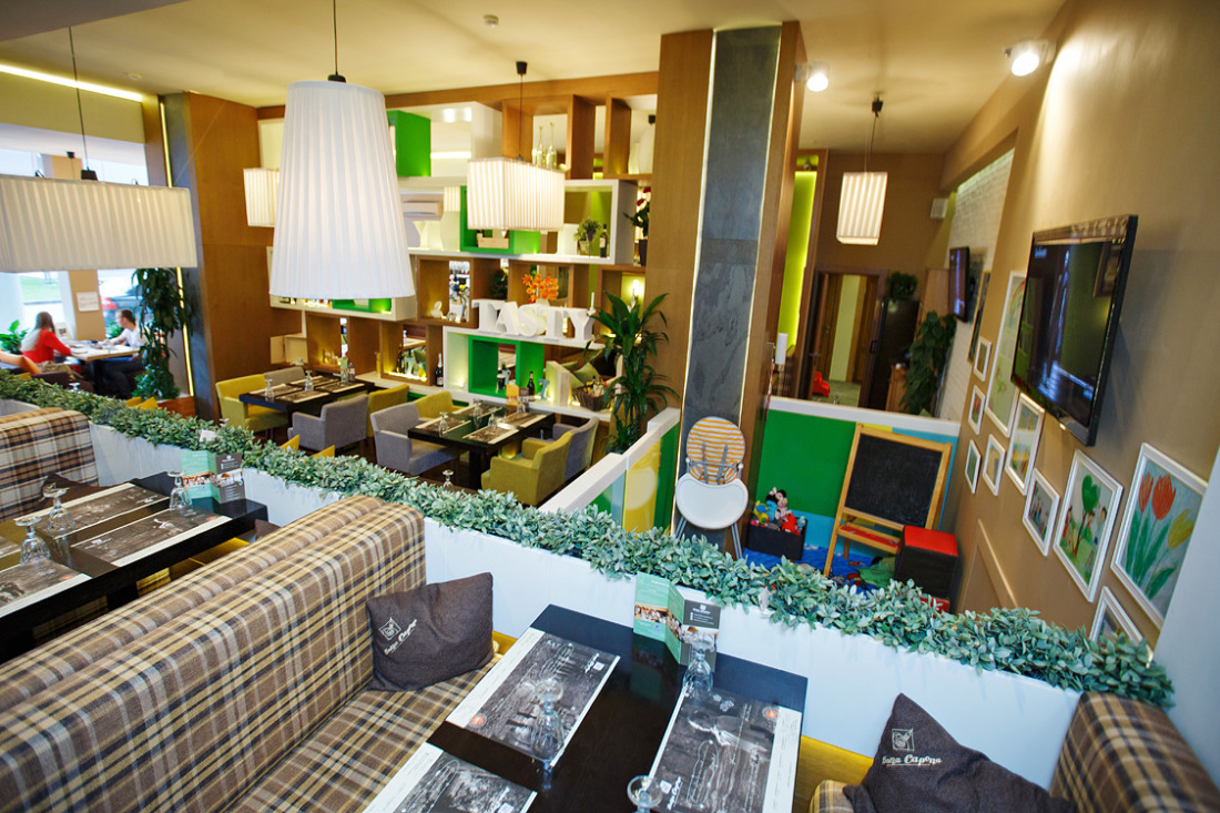 Интерьер яркий, стильный, но в то же время домашний. Гости могут расположиться на небольших диванчиках, а дети могут спокойно поиграть в детском комнате. Утром, перед работой, можно забежать на завтрак.
