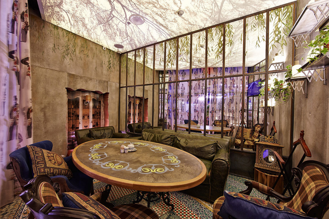 В интерьере – яркая цветовая гамма, обилие мягкой мебели с подушками, ковры на полах. Уют создают оригинальные красочные светильники, зелёные растения, деревянные столы с инкрустацией. Для малышей организована детская комната. Регулярно устраиваются шоу-программы.
