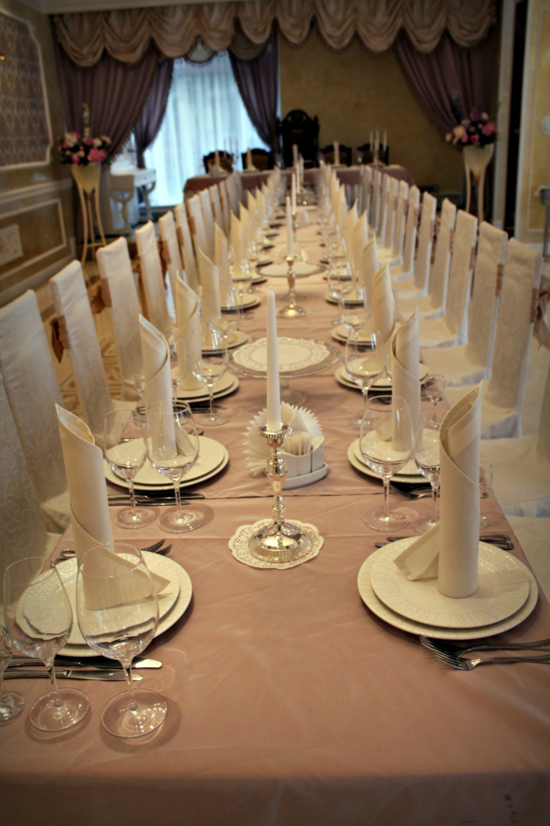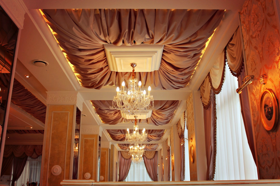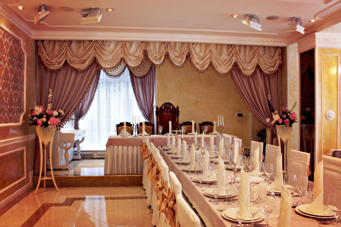 Два зала в стиле ампир – на 110 и 320 гостей каждый – украшены позолотой, а стены и потолок декорированы драпировками из текстиля и массивными люстрами. Обилие кожаной мебели, стульев и элементов из тёмного дерева отличает основной зал.
