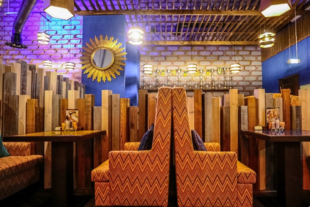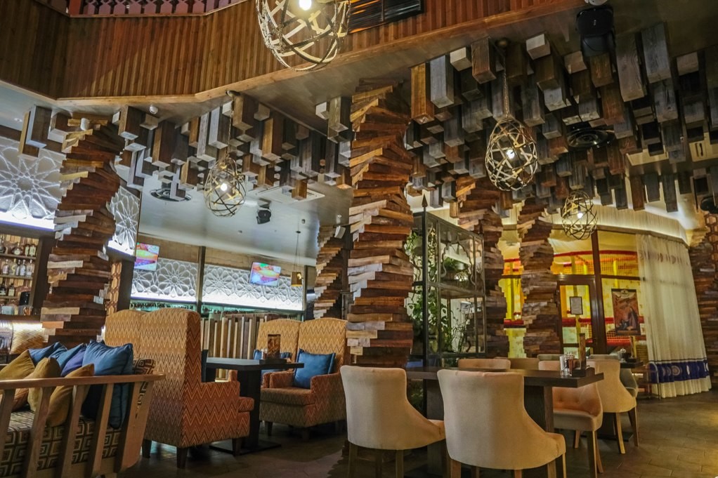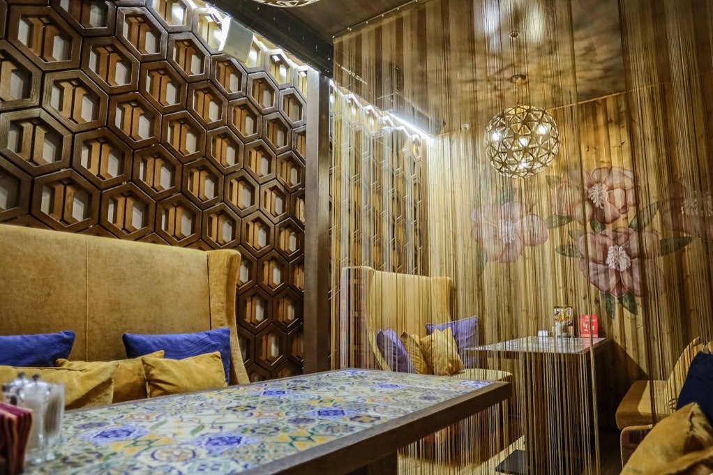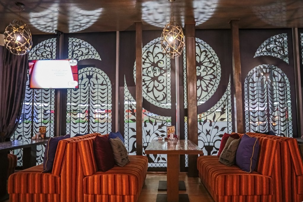 Двухэтажное пространство заведения выполнено в восточном стиле. Яркий стильный интерьер с такими же яркими восточными решениями. Гостей заведения приятно обрадуют панорамные окна в заведении, лаунж-зона и паровые коктейли.