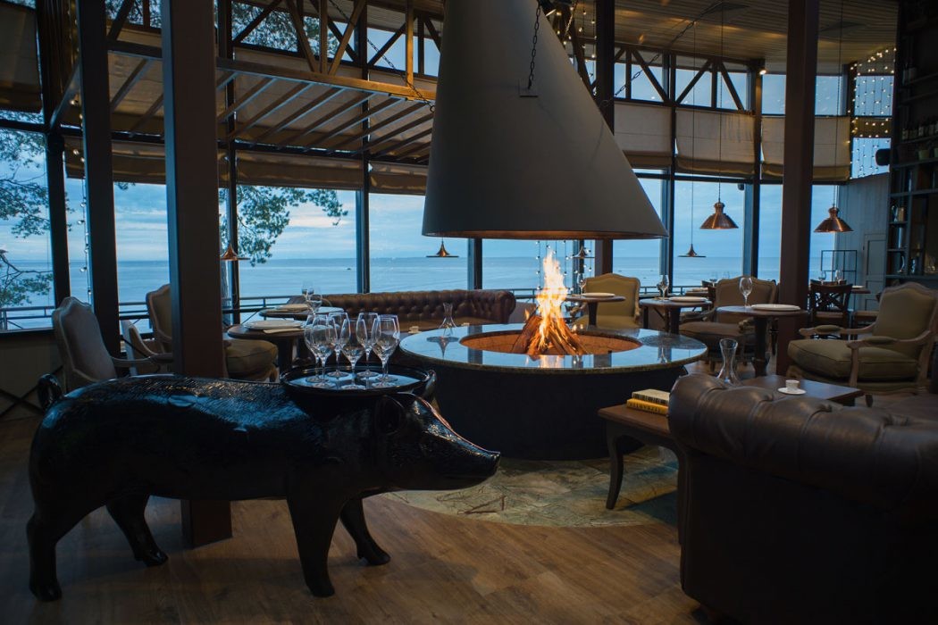 Основной зал ресторана очень вместительный (до 150 гостей). В теплое время также можно разместиться на большой террасе. Для тех, кто приехал не только поесть, но и активно отдохнуть, на берегу предлагают велосипеды, ролики и активные игры. А в случае плохой погоды вас согреет большой камин.