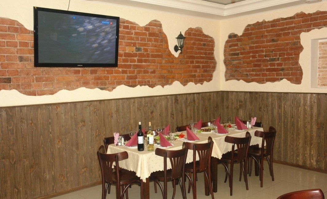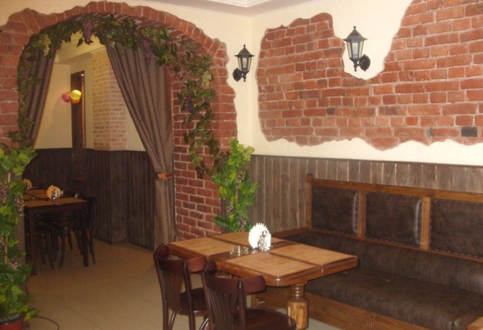Интерьер выполнен в уютном стиле грузинского ресторана с кирпичными стенами и деревянной мебелью. Это место отлично подходит для проведения небольшого банкета или корпоратива, кроме того, для любителей спеть здесь имеется караоке. По будням гости могут заказать бизнес-ланч.