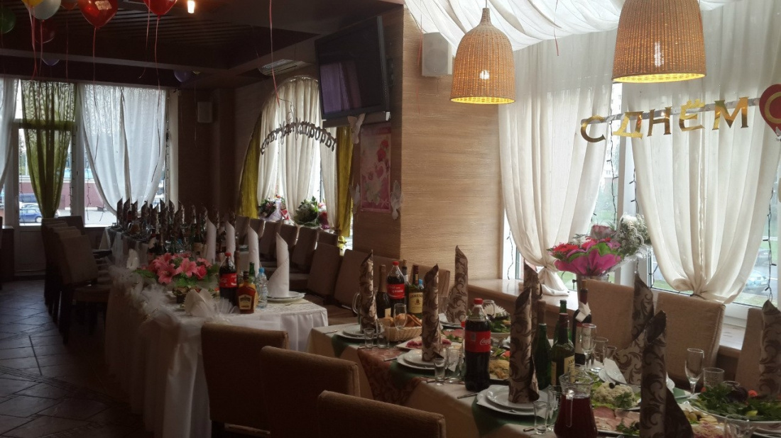 В кафе два зала, есть отдельное помещение для проведения небольших банкетов на 25 человек. С четверга по воскресенье по вечерам играет живая музыка. Регулярно проводятся акции: например, скидки для больших мужских или женских компаний.