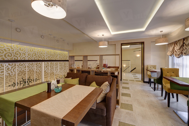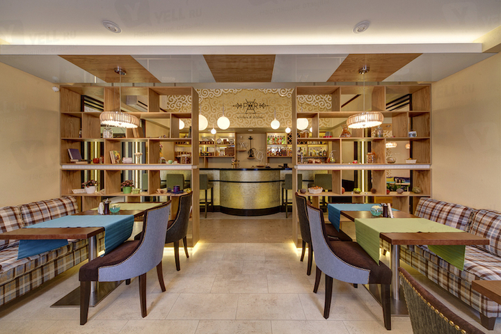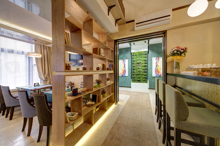 Эко-интерьер заведения декорирован большим количеством зелени, деревом и живыми цветами. Пространство заведения разделено на различные зоны, где можно уединиться небольшой компанией на диванчиках, посидеть в общем зале за столами с мягкими стульями и расположиться за барной стойкой.