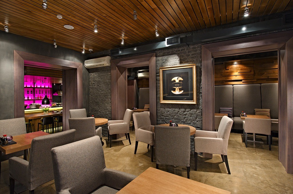 Стильный интерьер в коричневых тонах, свою изюминку дизайну интерьера придает подсветка. Из декораций можно отметить буддистские фигурки. Из окон открывается великолепный вид на Манежную площадь.