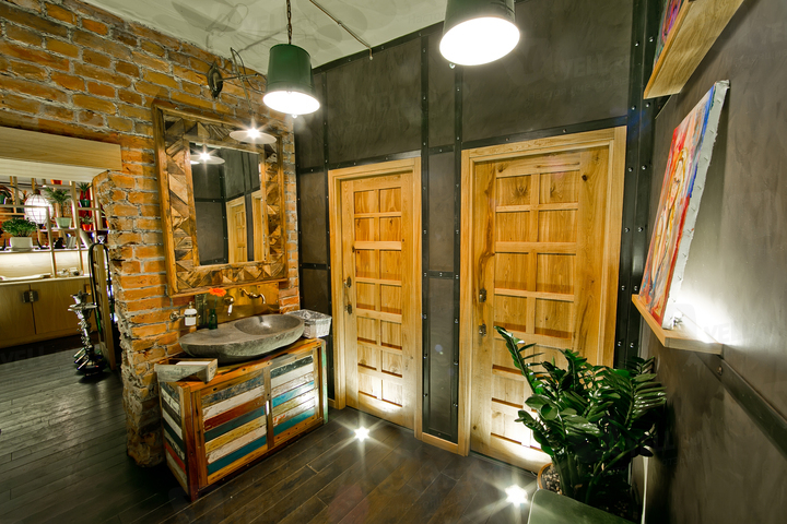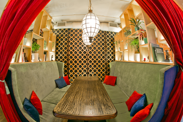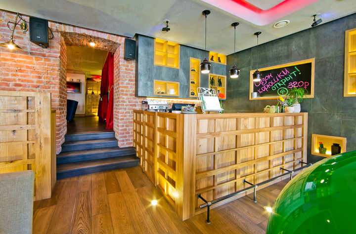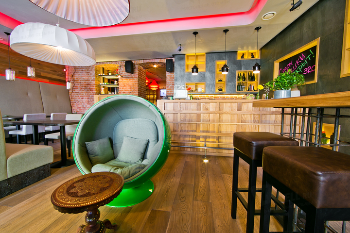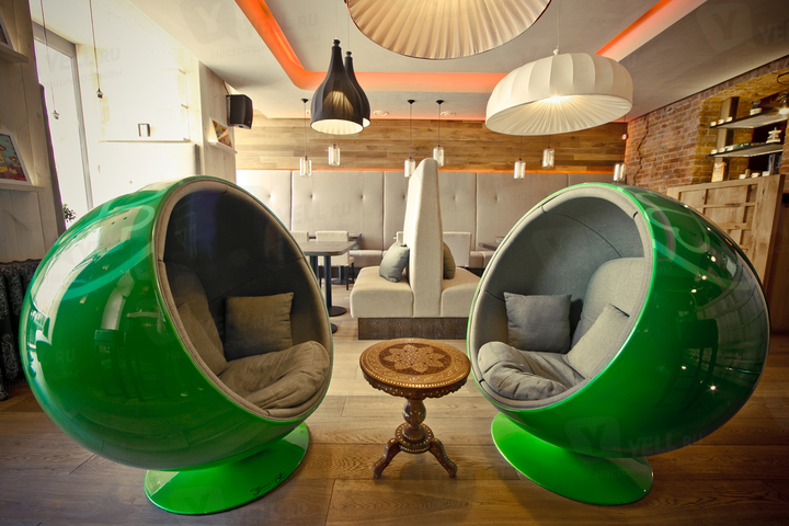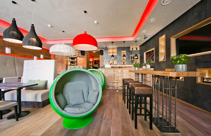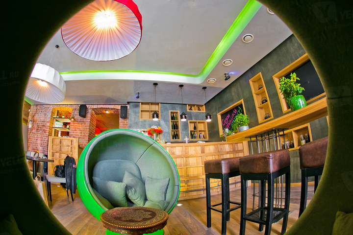 Креативный и разнообразный интерьер - это главная фишка заведения. Кирпичные стены, дизайнерские люстры, яркие элементы декора. Гости заведения могут расположиться в круглых диванчиках или уединиться за ширмой компанией из 4 человек. По утрам сюда можно зайти на завтрак, а будние дни на бизнес-ланч.