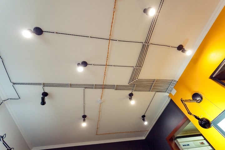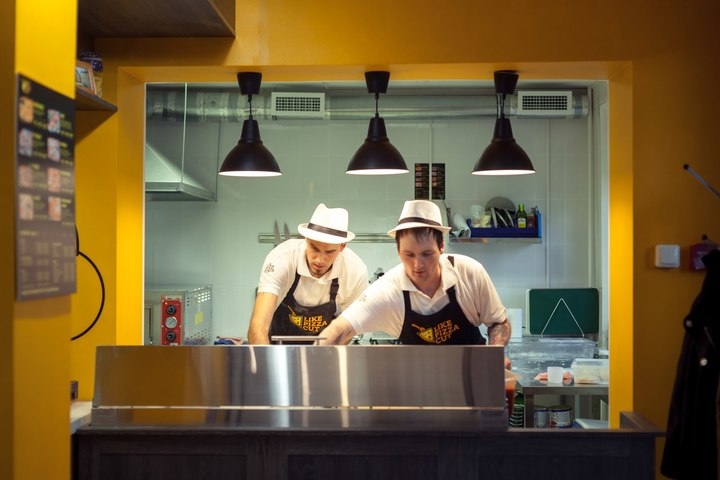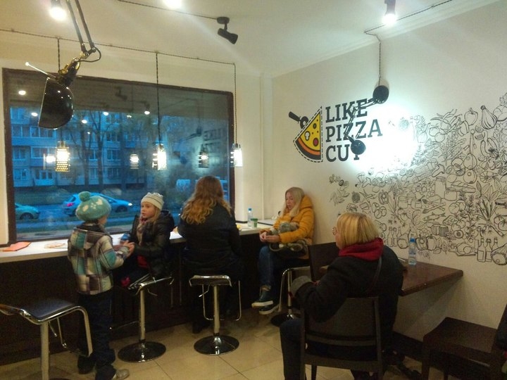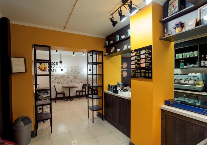 Посетители располагаются за небольшими столиками в зале или за стойкой у панорамного окна. Интерьер оформлен в бежево-оранжевых тонах, напоминающих о солнечной Италии. Стены украшены рисунками, изображающими различные продукты, используемые в приготовлении пиццы.