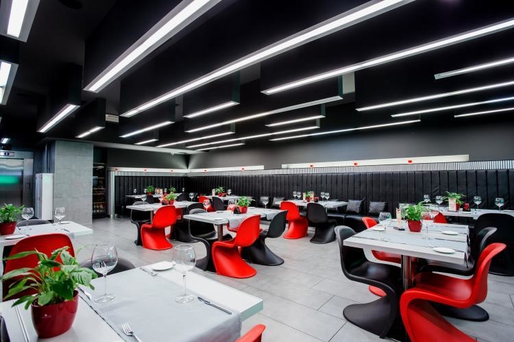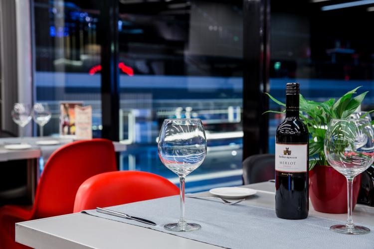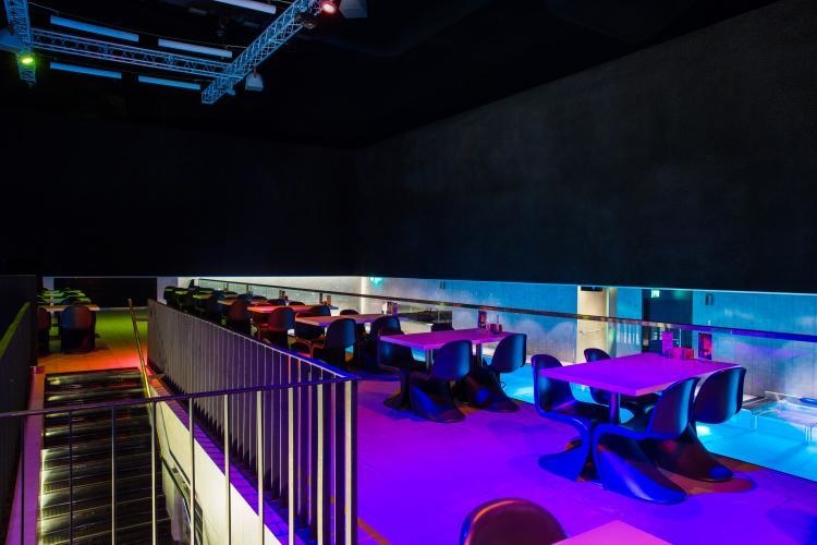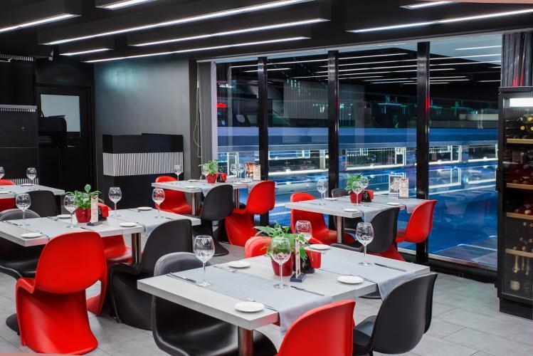Сухая зона ресторана расположена за стеклом от бассейна. В непосредственной близости от воды находятся две площадки: верхняя - для показов мод и презентаций, а также других мероприятий, и нижняя - со столиками, за которыми можно непосредственно наблюдать за водной гладью.