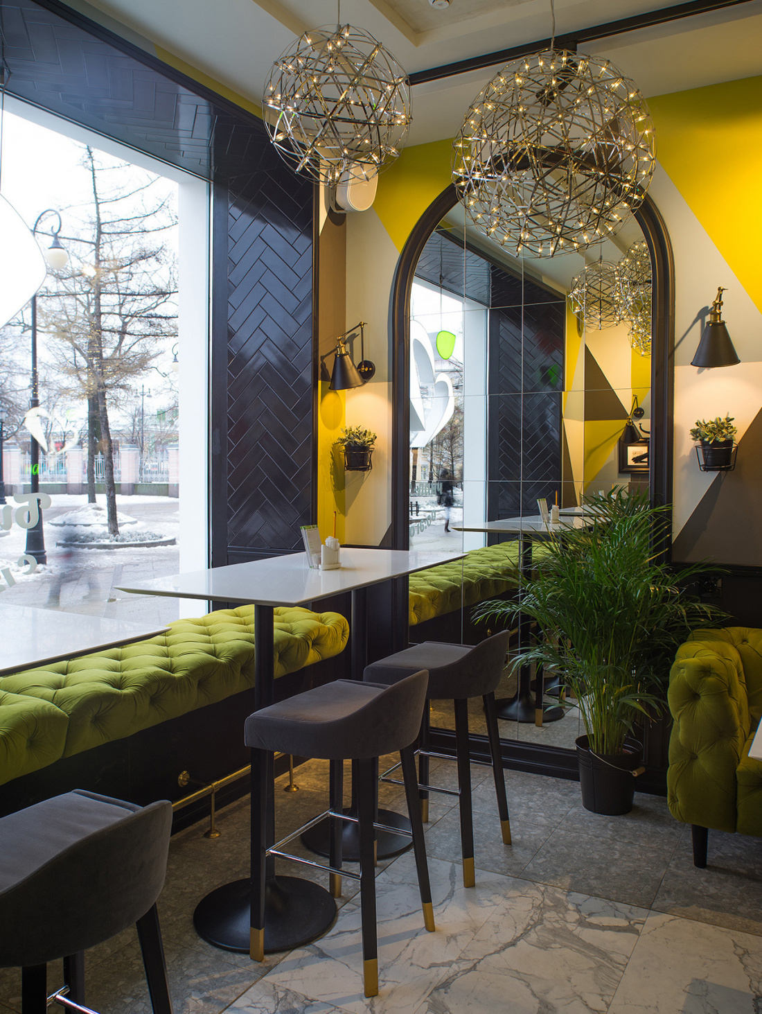 Интерьер ресторана выполнен в стиле модерн, здесь преобладают фирменные цвета - зеленый и голубой. Гости заведения могут расположиться на уютных диванчиках около окон с панорамным видом. В заведении есть детская комната с игрушками, а также отдельное детское меню с здоровой пищей. В будние дни сюда можно зайти перекусить на бизнес-ланч или завтрак.
