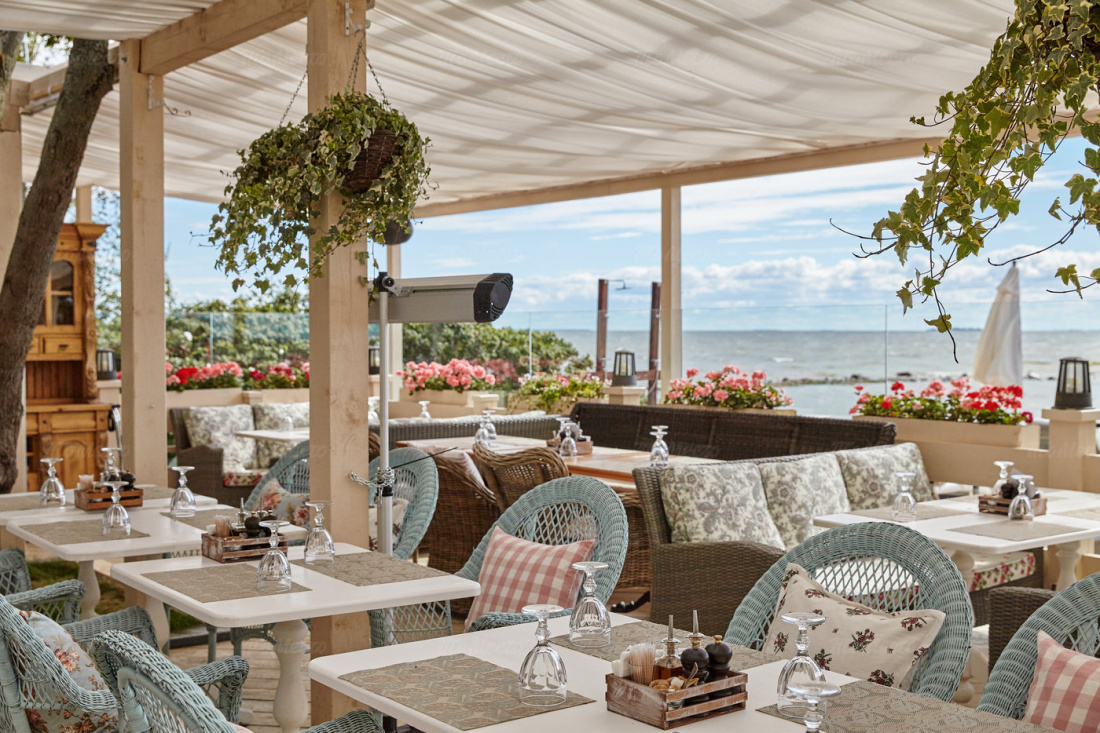 Старинные буфеты, книжные шкафы, цветастые диваны, абажуры с бахромой, шторы с рюшами, фотографии и картины на стенах создают колорит заведения. На открытой веранде расположены плетёные кресла, столы с белыми скатертями, ковры, горшки с петуньями. Открывается восхитительный вид на водные просторы.