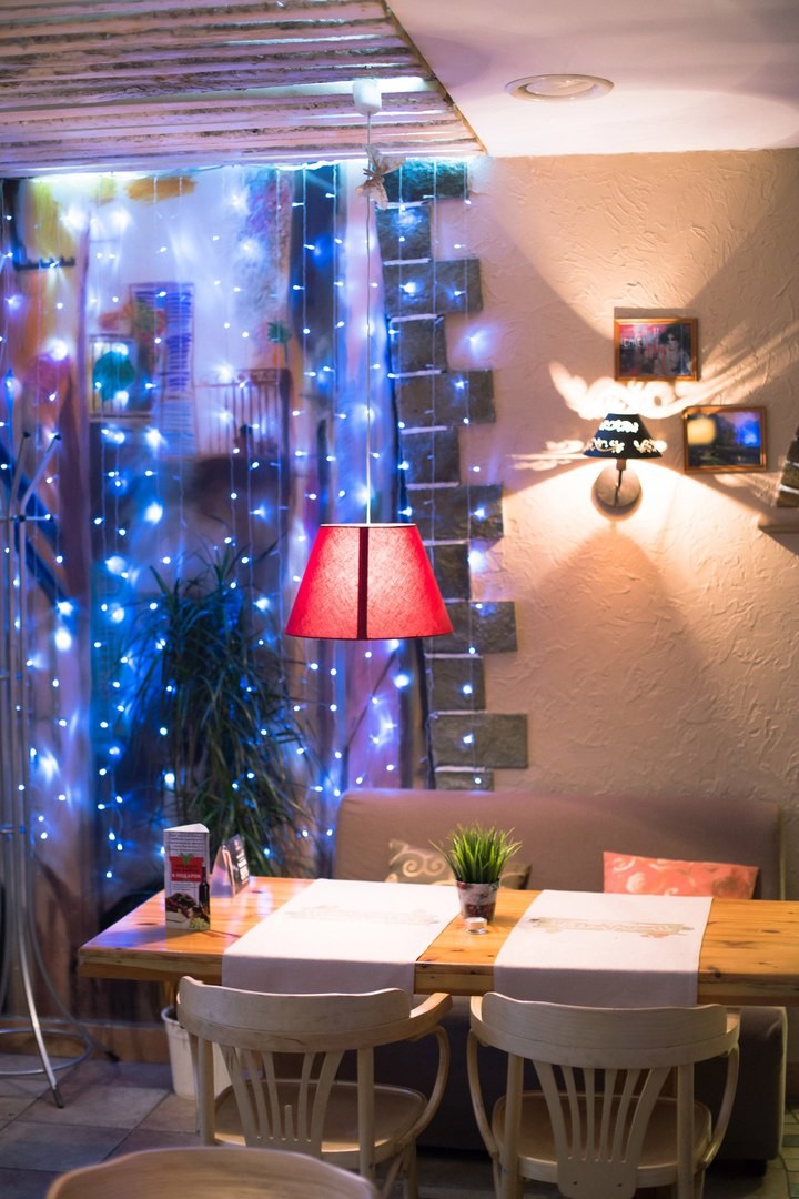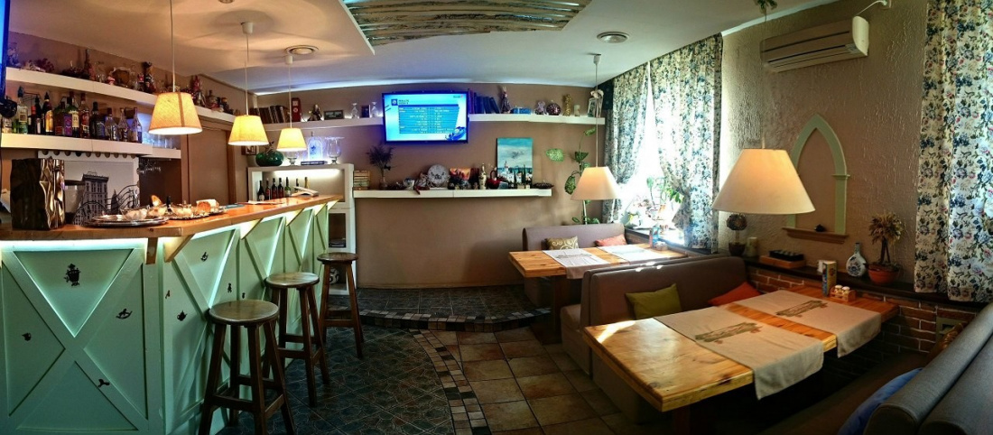 Интерьер напоминает домашнюю атмосферу - низкие люстры, зелень в домашних горшочках и уютные диванчики с подушками. Гости могут заказать паровые коктейли. Практически каждый день проходят выступления музыкантов и певцов.