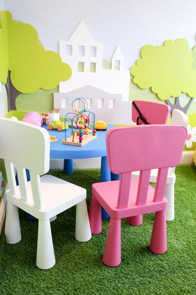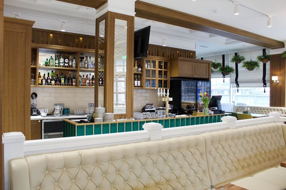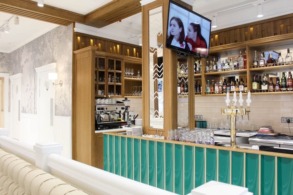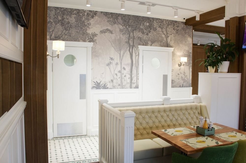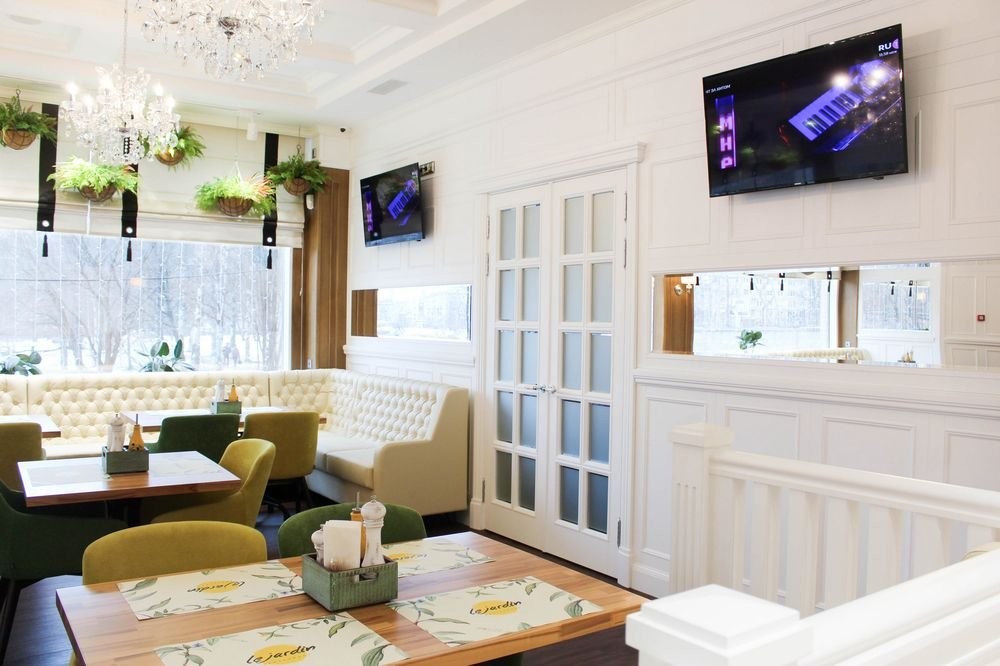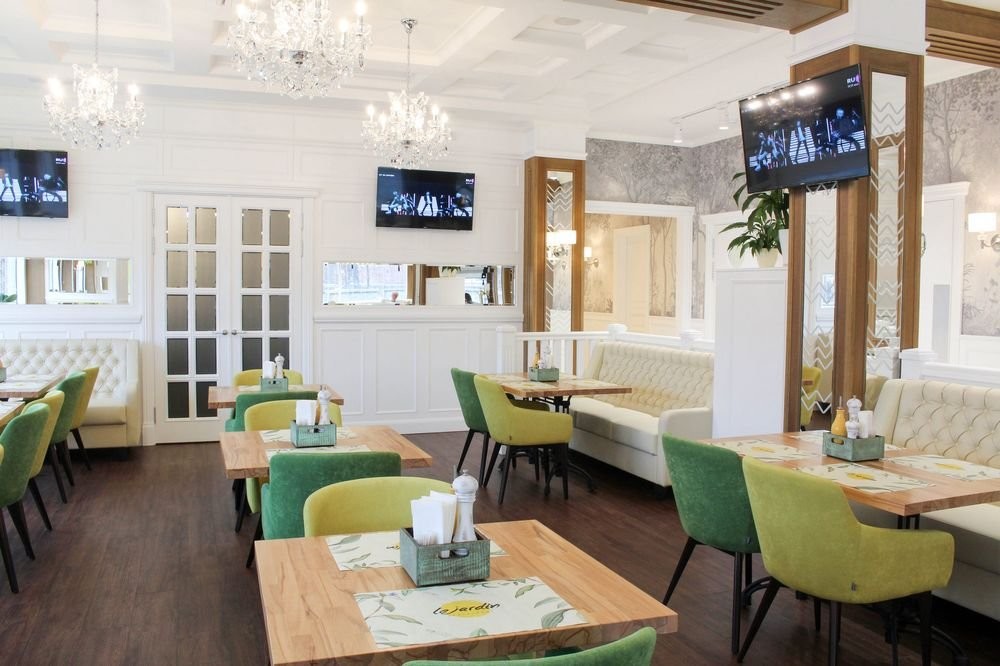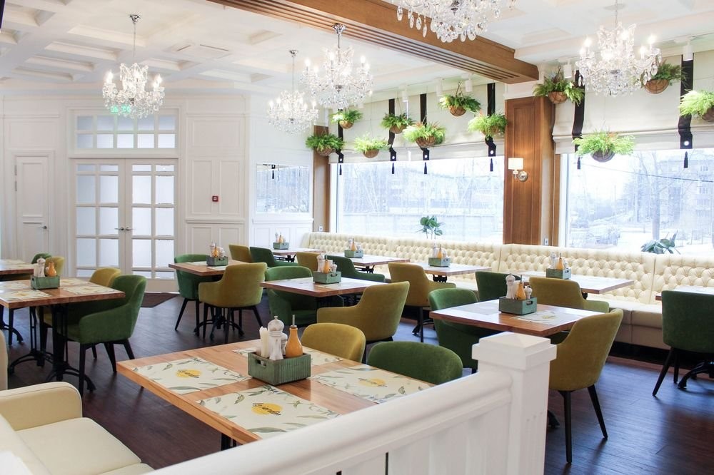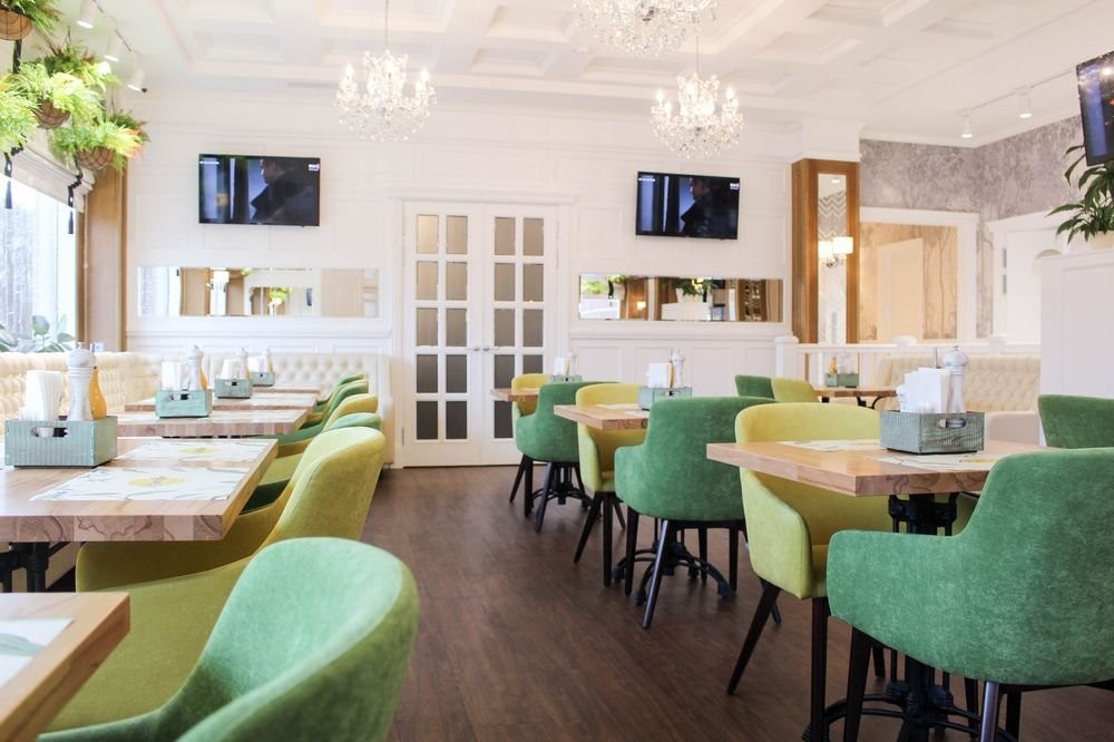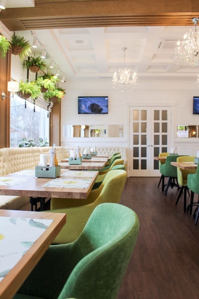 Интерьер заведения гармонично сочетает белоснежные стены, панорамные окна, яркую зеленую мебель, утонченные люстры и зелень в качестве декора.