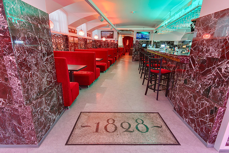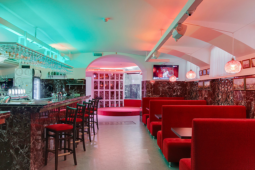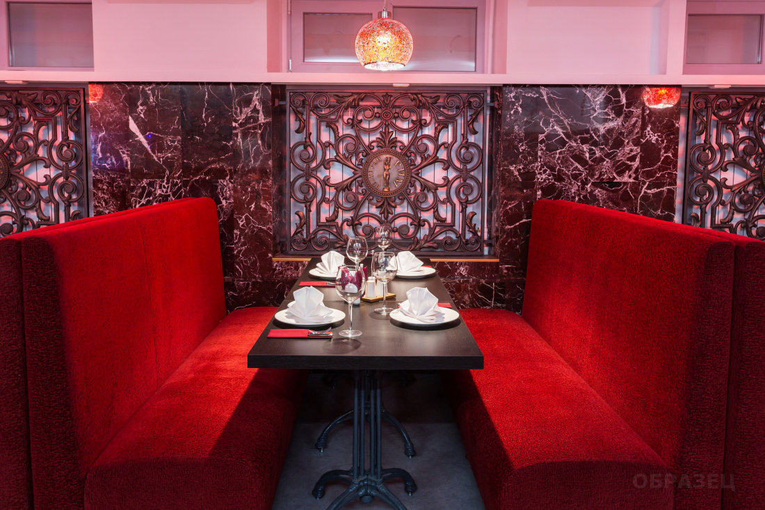 Мраморные стены заведения чередуются с узорчатыми решётками. Гармоничный контраст даёт мягкая мебель из красного велюра, а между арочными потолочными балками висят картины и гравюры. С помощью скрытой подсветки можно быстро менять фон зала.