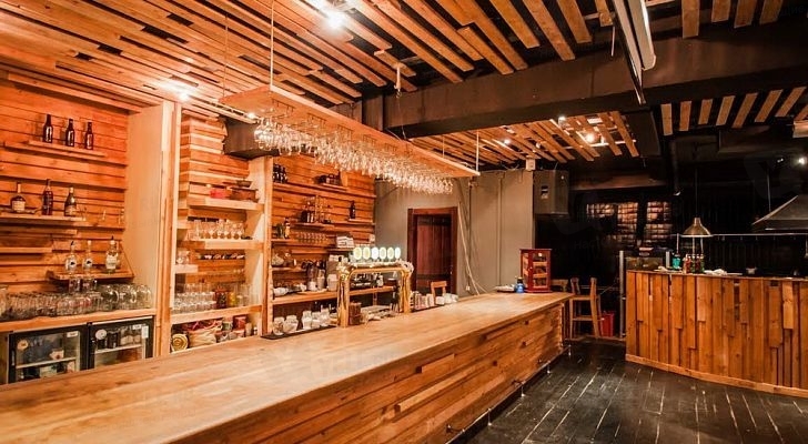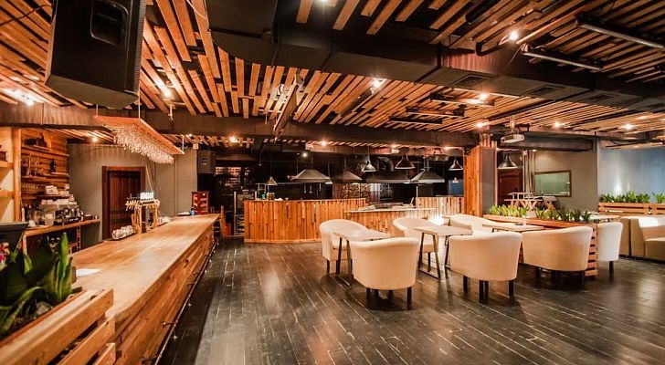 В отделке ресторана использованы деревянные доски, неплотно подогнанные друг к другу. Зелень в высоких ящиках оттеняет светлый интерьер и зонирует столики. Пока гости расслабляются на мягких полукреслах, официанты подносят блюда на ледяных подушках, куске камня, в капустном кочане.