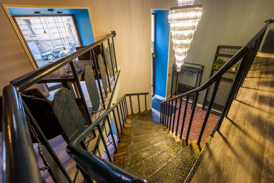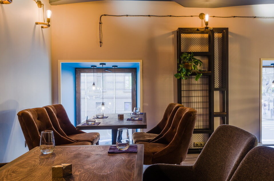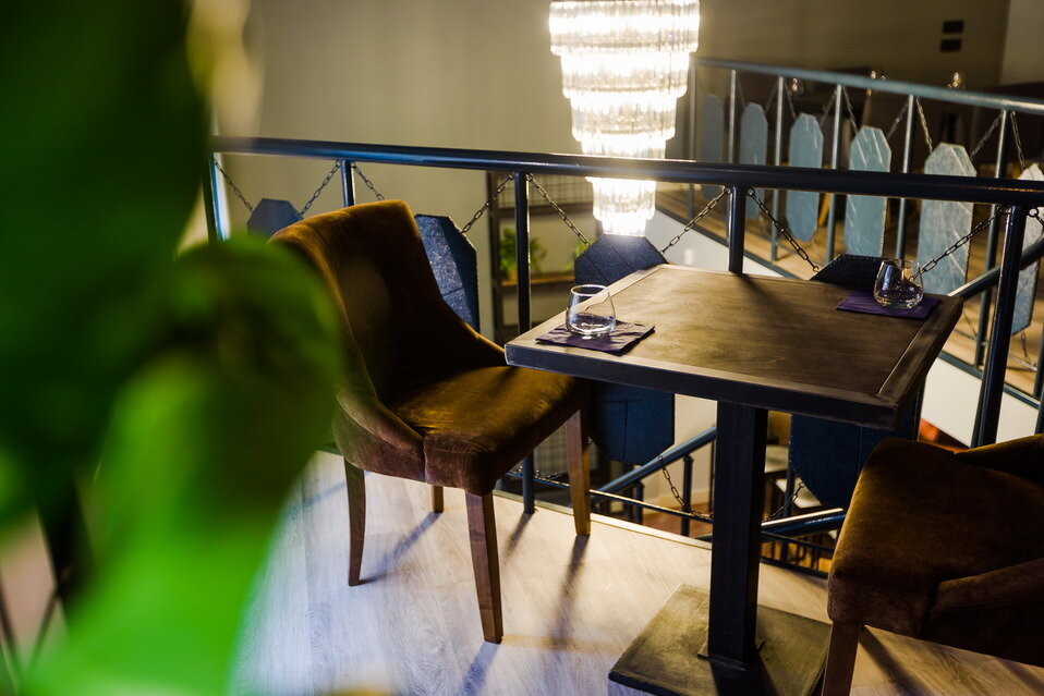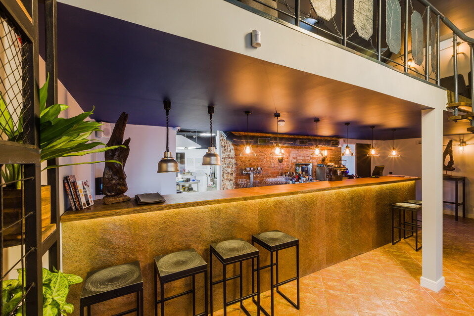 Интерьер ресторана выполнен в простом и современном стиле. Ощущение лофт пространства создает обилие дерева и зелени.