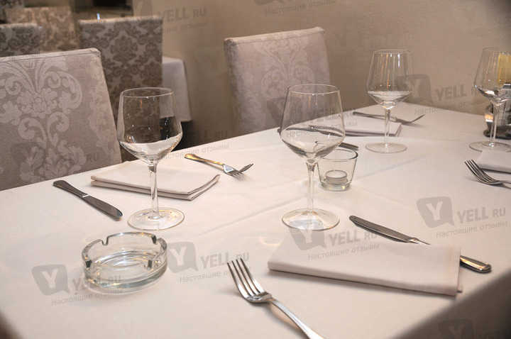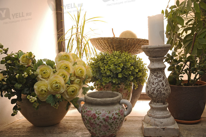 Ковры, тканевые светильники, статуэтки, вазочки, цветущие растения, корзинки, фотографии в рамках создают колорит, свойственный жилому помещению. Гости располагаются на удобных стульях, покрытых светлыми тканевыми чехлами, за столами с белыми скатертями.