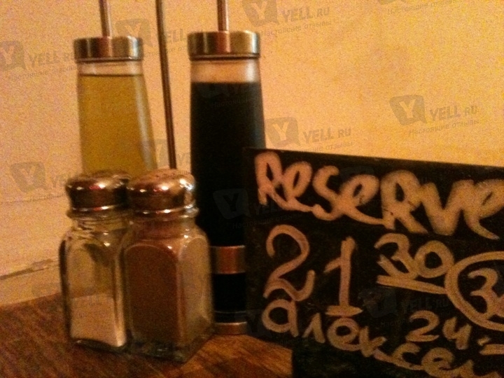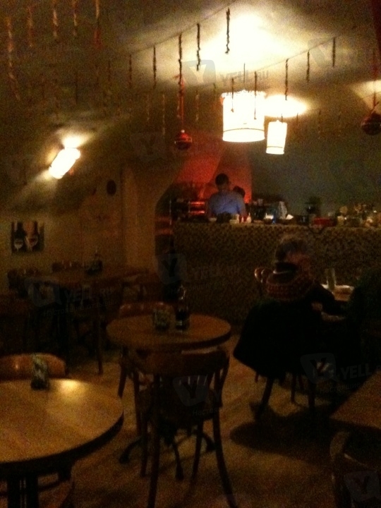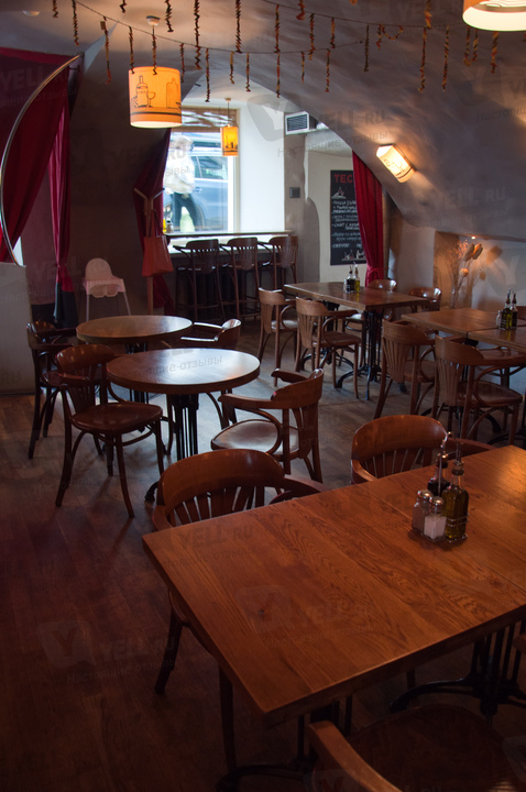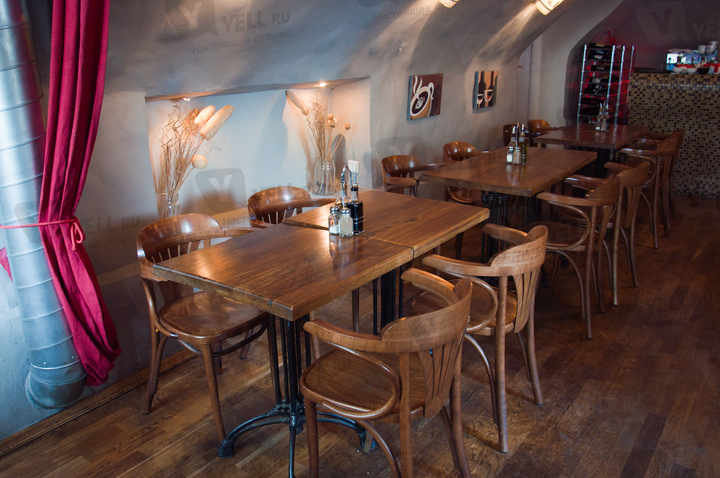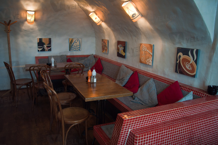 Интерьер создан в стиле 70-х. Сводчатые потолки и стены окрашены в белый цвет. В зале размещены небольшие столики и лёгкие стулья из дерева. На стенах – картины художников-абстракционистов. Уют создают светильники с тёплым желтоватым светом.