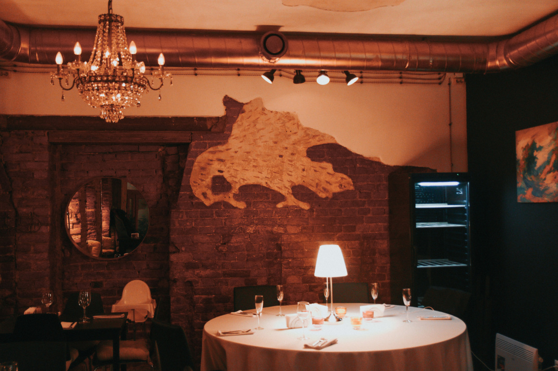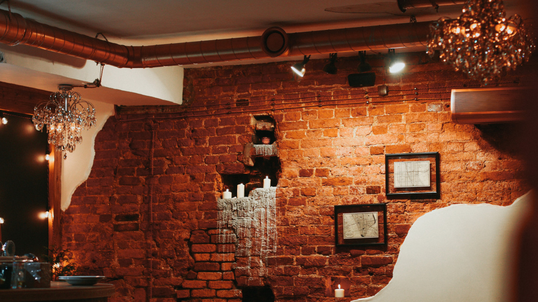 Интерьер заведения выглядит в стиле лофт - красные кирпичные стены, в которых есть декорированные дырки со свечами, необычные люстры, а также подоконники с подушечками, на которых можно посидеть. В будние дни сюда можно забежать пообедать бизнес-ланч.