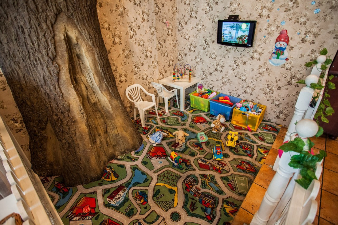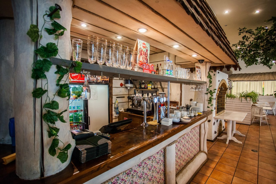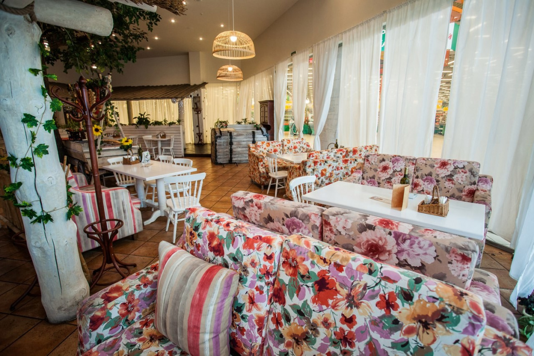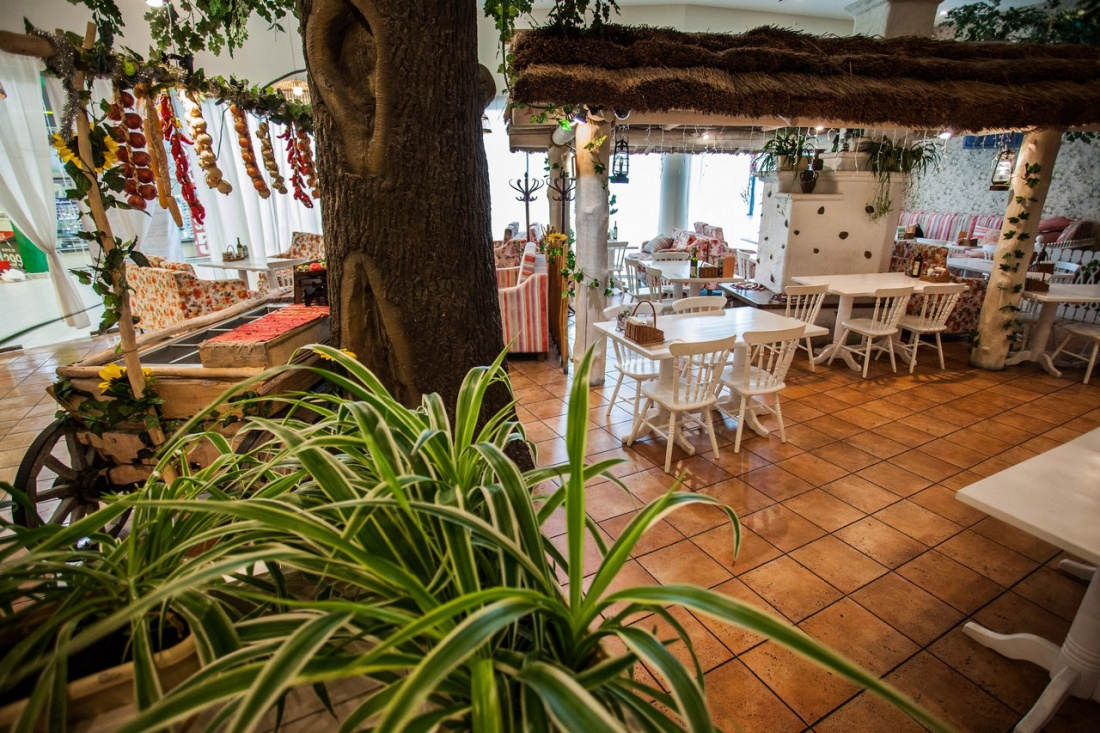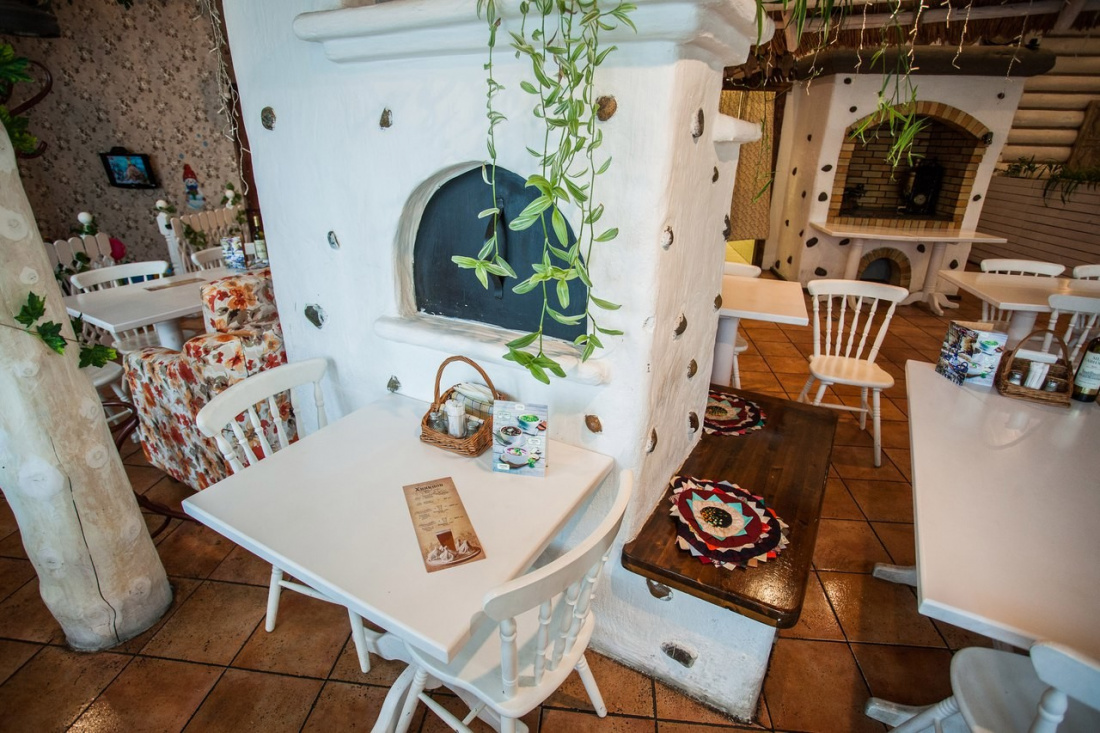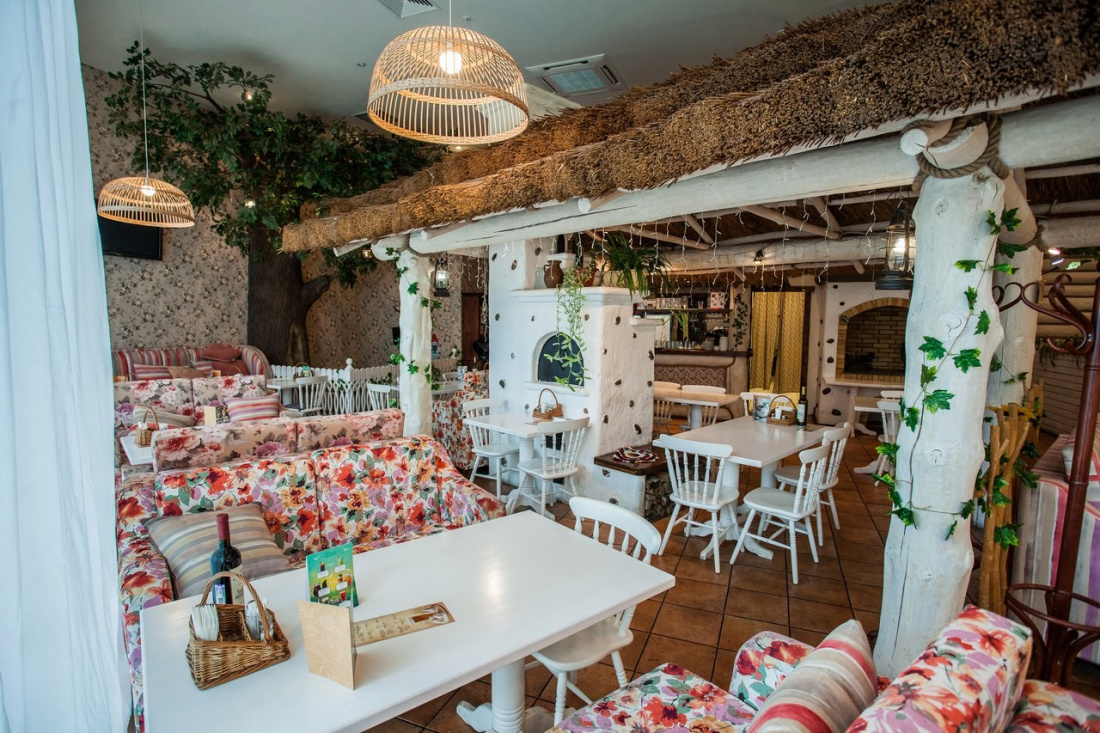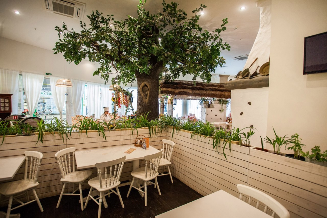 Интерьер в стиле деревенского подворья: мягкие светлые диваны и традиционные деревянные столы. Рядом со столами много зеленых растений, есть даже настоящая русская печь в качестве элемента интерьера.