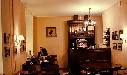 Интерьер кафе выглядит по-домашнему: стены украшены фотографиями, недалеко от окна стоит старинный дубовый шкаф, светильники с абажурами излучают мягкий свет. Гостей обслуживает хозяин заведения и его семья.