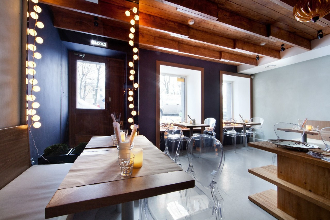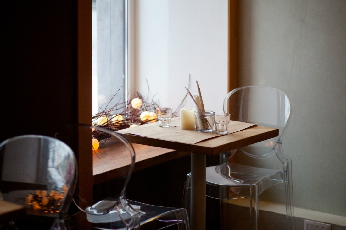 Интерьер в минималистичном стиле. Гости могут расположиться за столиками на двоих около окна. С 12 до 16 часов можно зайти на ланч.