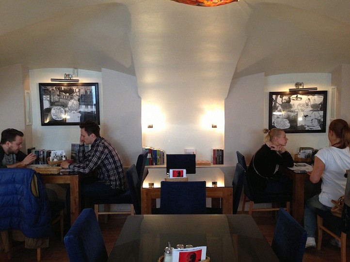 В простой обстановке стильные акценты – авторские фото и картины, яркие абажуры, а игрушки и подушки создают домашний уют. Гость может воспользоваться айпадом заведения или отдохнуть, полистать книгу или свежую периодику, посмотреть Евроньюс.